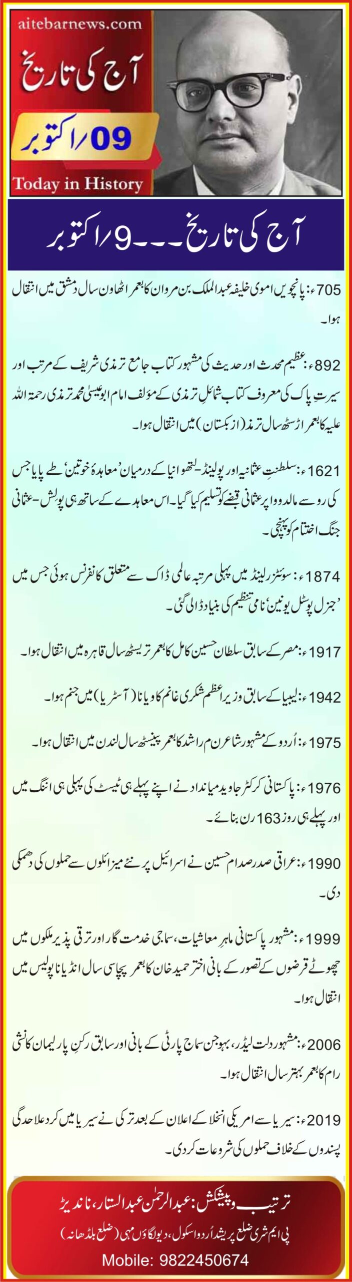 آج کی تاریخ۔۔۔9؍اکتوبر