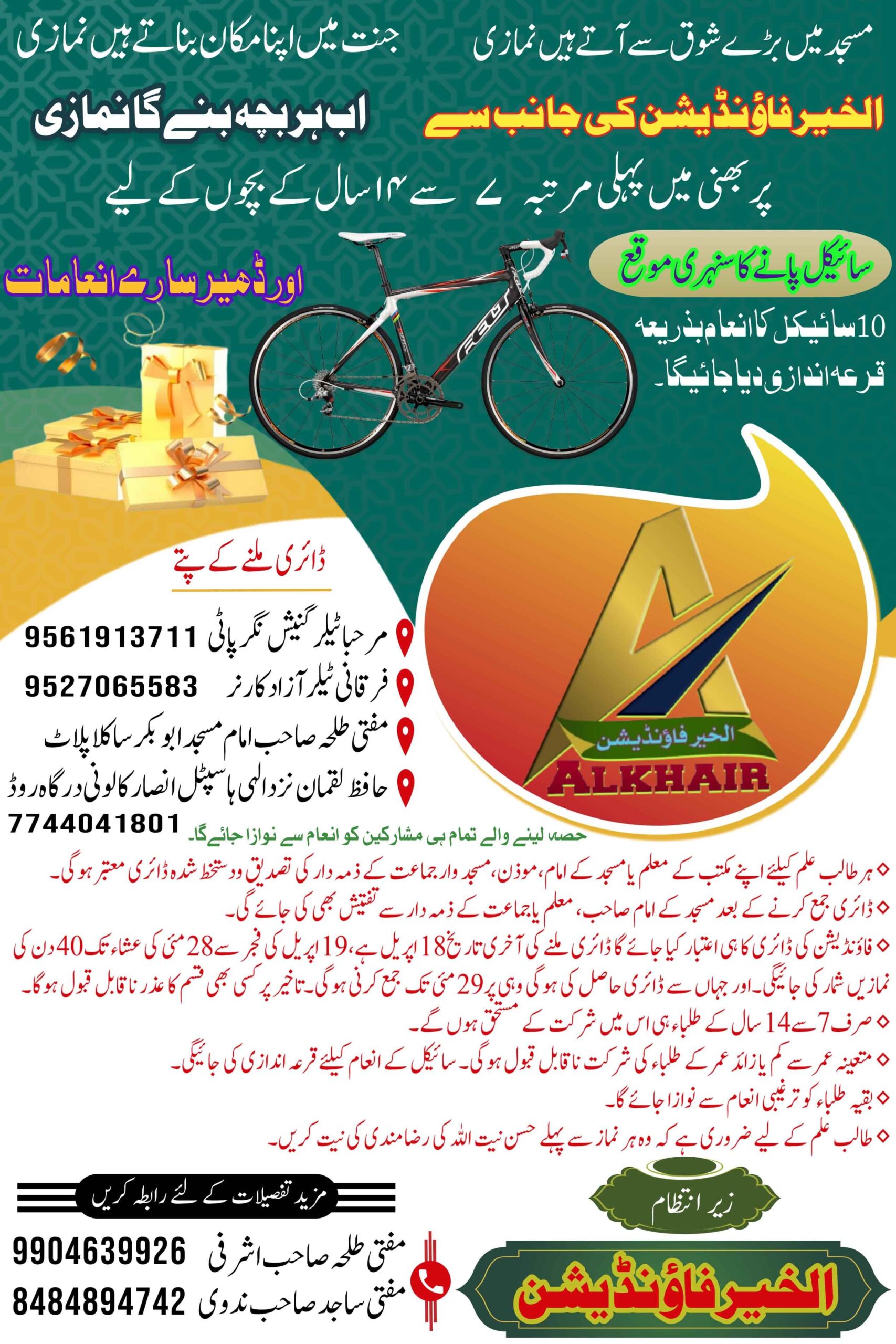 پربھنی:18؍اپریل( ضلع نامہ نگار اعتبار نیوز محمد سرور شریف ) الخیر فاؤنڈیشن کی جانب سے 7 تا 14 سال کی عمر کے بچوں میں نماز پڑھنے کا شوق پیدا کرنے ، باجماعت نماز ادا کرنے پانچ وقت کی نماز پابندی سے ادا کرنے کی فکر و رحجان پیدا کرنے کی غرض سے شہر پر بھنی میں الخیر فاؤنڈیشن کی جانب سے مورخہ 19 اپریل کی فجر تا 28 مئی کی عشاء تک 40 دن پابندی سے نماز ادا کرنے والے بچوں میں بطور انعام و حوصلہ افزائی سائیکل تقسیم کرنے اور دیگر ترغیبی انعامات دینے کا ایک پروگرام ترتیب دیا گیا ہے ، اس 40 روزہ پروگرام کی ترتیب اور شرائط حسب ذیل ہیں ۔
