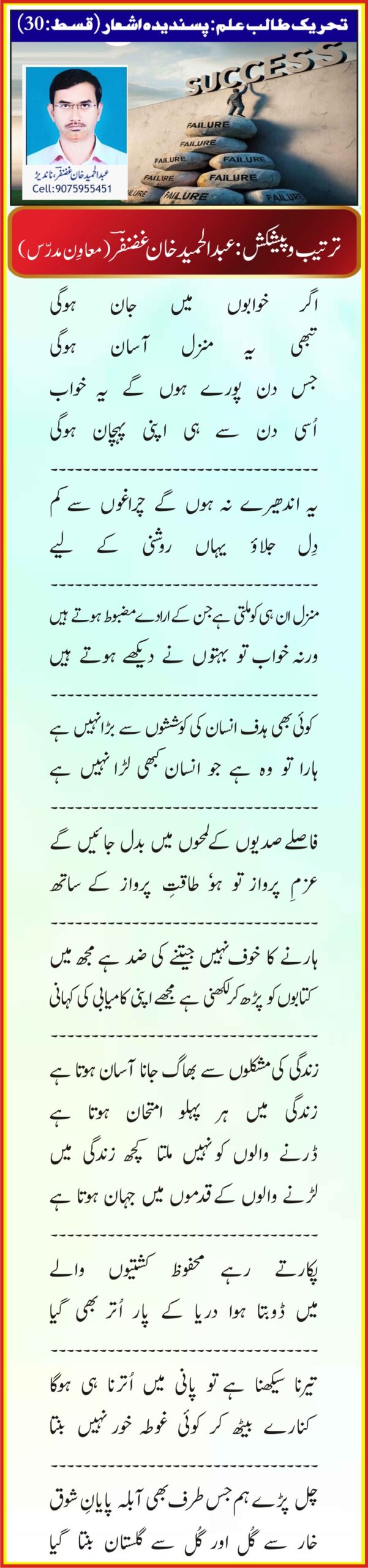 ترتیب و پیشکش: عبدالحمید خان غضنفرؔ ( معاوِن مدرس)