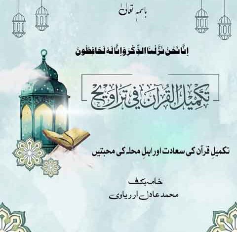 اللہ ربّ العزت کا بے پایاں فضل و کرم ہے کہ گزشتہ شب مجھے آٹھویں مرتبہ نماز تراویح میں قرآن کریم کی تکمیل کی سعادت حاصل ہوئی یہ میرے لیے انتہائی عظیم اعزاز اور قابل شکر نعمت ہے الحمدللہ جب سے اللہ تعالیٰ نے حفظ قرآن کی دولت سے نوازا ہے تب سے ہر سال رمضان المبارک میں تراویح کے ذریعے قرآن کریم سنانے کا شرف حاصل ہوتا رہا ہے اور اس سال بھی اسی سعادت سے بہرہ مند ہوا تکمیل قرآن کے بعد معمول کے مطابق تقریباً آدھا گھنٹہ ناچیز نے مختلف اہم دینی موضوعات پر گفتگو کی جن میں فضیلت قرآن شب قدر کی عظمت و برکت اور والدین کی خدمت و اطاعت کی اہمیت جیسے عنوانات شامل تھے اس کے بعد مسجد کے معزز امام صاحب حافظ ریاض الدین صاحب نے نہایت مختصر مگر جامع اور مؤثر نصیحت فرمائی ان کی پُراثر گفتگو کے بعد انہی کے ہاتھوں اجتماعی دعا ہوئی اور یوں یہ بابرکت مجلس اپنے اختتام کو پہنچی۔ یہ بھی اللہ ربّ العزت کا خاص کرم ہے کہ پورے رمضان المبارک میں الحمدللہ ایک بھی تراویح قضا نہیں ہوئی یہ اللہ ربّ العزت کی خصوصی توفیق اور مہربانی ہے جس پر جتنا بھی شکر ادا کیا جائے کم ہے۔