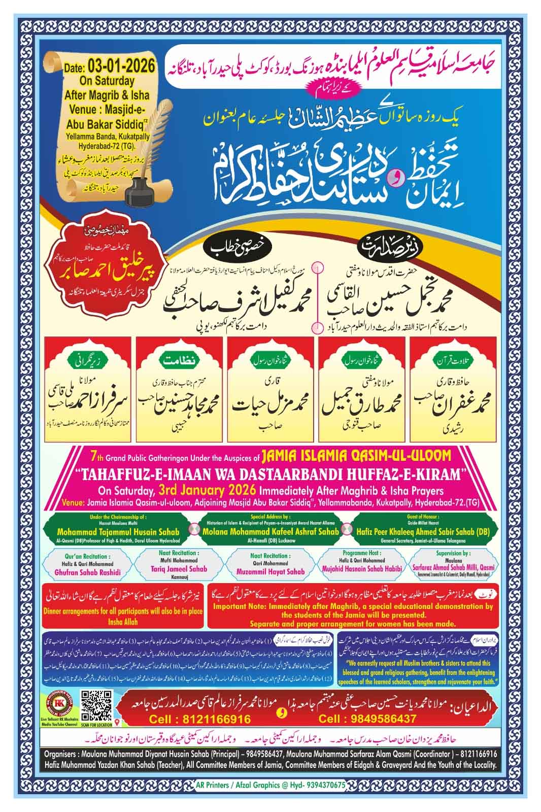 حیدرآباد 2جنوری (راست) مولانا دیانت حسین ناظم جامعہ کی اطلاع کے بمو جب،جامعہ اسلامیہ قاسم العلوم،ایلما بنڈہ، کوکٹ پلی،حیدرآباد کے زیر اہتمام ایک روزہ ساتواں عظیم الشان اجلاس عام بعنوان "تحفظ ایمان و دستار بندی حفاظ کرام” بتاریخ 3جنوری 2026 بروز ہفتہ،بعد نماز مغرب احاطہ جامعہ،متصل مسجد ابوبکر صدیق،ایلما بنڈہ میں منعقد ہوگا،جس کی صدارت حضرت مولانا مفتی تجمل حسین قاسمی صاحب،استاد حدیث وفقہ دارالعلوم حیدرآباد فرمائیں گے اور مہمان خصوصی کی حیثیت سے قائد ملت حضرت حافظ پیر خلیق احمد صابر صاحب جنرل سکریٹری جمعیت علماء تلنگانہ،شرکت فرمائیں گے،اسی طرح ملک کے نامور اور معروف خطیب حضرت علامہ مولانا کفیل اشرف صاحب لکھنؤ کا خصوصی خطاب ہوگا،جلسے کا آغاز قاری محمد غفران رشیدی صاحب،استاذ جامعہ کی تلاوت سے ہوگا،ممتاز نعت خواں،مولانا مفتی طارق جمیل قاسمی اور قاری مزمل حیات صاحب نعت پاک سنانے کی سعادت حاصل کریں گے۔معروف ناظم اجلاس جناب مجاہد حسنین حبیبی صاحب جلسے کی نظامت اور مولانا سرفراز احمد ملی القاسمی ممتاز صحافی و کالم نگار روزنامہ منصف حیدرآباد،جلسے کی نگرانی فرمائیں گے۔اس موقع پر جامعہ سے تکمیل حفظ قران کرنے والے 16 حفاظ کرام کی دستار بندی علماء کے ہاتھوں کی جائے گی،طلبہ جامعہ کا تعلیمی مظاہرہ بھی ہوگا،خواتین اسلام کے لیے پردے اور تمام شرکاء کے لیے تناول طعام کا نظم رہے گا،ان شاءاللہ۔انتظامی کمیٹی نے عامتہ المسلمین اور خواتین و حضرات سے کثیر تعداد میں شرکت کی گزارش کی ہے،مزید تفصیلات کے لیے دیے گئے نمبرات 9849586437 یا 8121166916 پر رابطہ کیا جاسکتاہے۔
