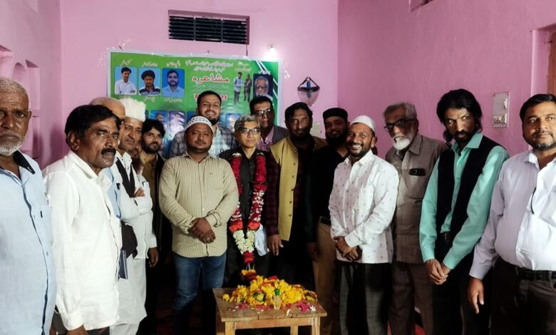 پربھنی:21جولائی ( بذریعہ نا مہ نگار محمد سرور شریف) بتاریخ 20 – جولائی بروز سنیچر شب 09 بجےجنتور میں راہی جنتوری کے دولت کدے پر شفیع احمد شفیع کا دوسرا شعری مجموعہ ” اعراب چشم” منظر عام پر آنے کی خوشی میں ایک پر وقار و کا میا ب استقبالیہ مشاعرہ کا انعقاد کیا گیا جس میں صاحب اعزاز شفیع احمد شفیع اور تمام شعراء کا پرتپاک استقبال کیا گیا جسکی مسند صدارت پر احمد خان ایم ۔ اے اورنگ آبادی جلوہ افروزتھے مشاعرہ میں اورنگ آباد ، پربھنی ، پرتور ، بسمت سیلو اور جنتور کے شعراء حضرات نے شرکت کی راہی جنتوری ، ڈاکٹر یوسف صابر اور صدر مشاعرہ نے شفیع احمد شفیع کے کلام وأنکی ادبی خدمات پر اظہار خیال کیا اور انھیں مبارکباد پیش کی نظامت کے فرائض ارشادضیا نے بحسن و خوبی انجام دیے مشاعرے کا آغاز شفیع احمد شفیع کی حمد پاک سے ہوا اور نعت نبی صلی اللہ علیہ وسلم پڑھنے کی سعادت عبد الرحیم مضطر اور شیخ چاند نے حاصل کی مشاعرہ میں جن شعراء نے سامعین کو اپنے کلام سے محظوظ فرمایا اُن میں عبد الرحيم مضطر ، شفیع احمد شفیع ، ڈاکٹر یوسف صابر اورنگ آباد ، عبد الواحد جاذب ، حبيب ،ہاشمی طہ صدیقی، صابر بسمتوی ، سیفی اعظمی سیف ، شاکرخان شاکر پرتوری ، رئیس عاجز پرتوری راہی جنتوری عبدالسمیع انصاری ، ایوب عالم سیلو ، منورشاه جنتوری مشتاق احمد جنتوری ، جن باذوق سامعين نے رونق محفل کو دوبالا کیا ان میں ریاض بھائی جان ، شفیع راہی ، سید موجود ، شکیل راہی ، اسمعیل پهلوان ، ابرا ہیم میکا نک موسی را بی و غیرہ کے نام شامل ہیں رات دیر گئے جوائنٹ کنوینئر شیخ مصطفیٰ کے اظہار تشکر پر کامیاب مشاعرہ کا اختتام عمل میں آیا ۔