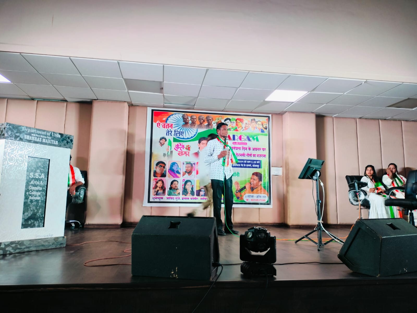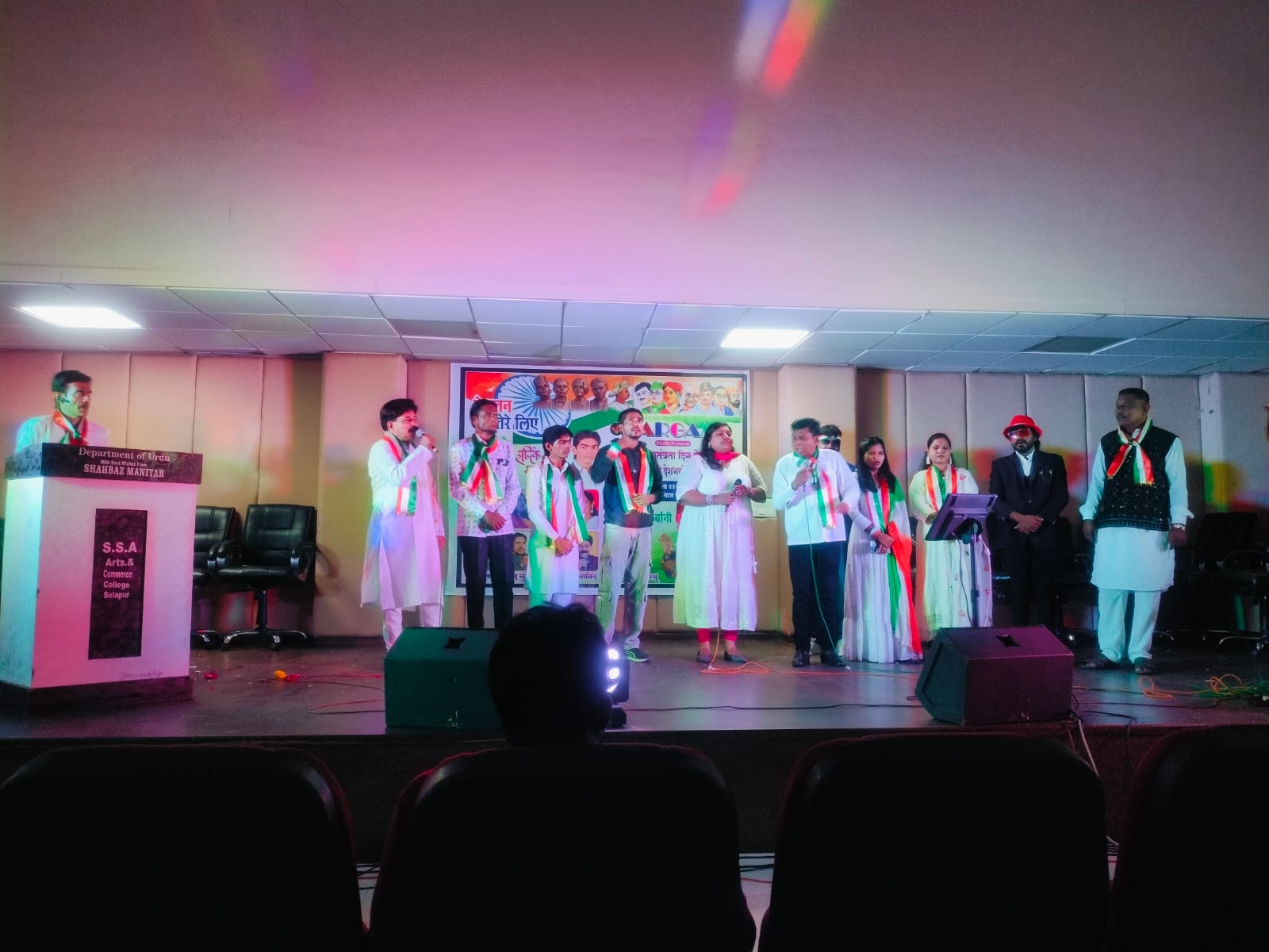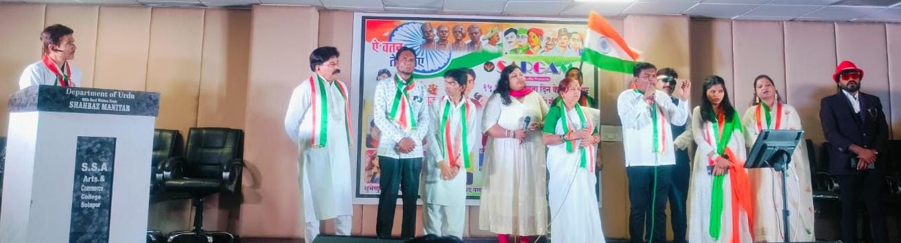 شولاپور :16؍اگست ( شیخ آفرین) سرگم کی اسٹوڈیو شولاپور جانب سے جشنِ آزادی کے موقع پر حُب الوطنی گیتوں کا پروگرام منعقد کیا گیا ۔ مورخہ پندرہ اگست کو اُردُو گھر شولاپور میں لیے گئے پروگرام میں عارف یلال ، مستقیم يلال اور لونجے برادران کی طرف دیش گیتوں کا نظرانہ بعنوان اے وطن تیرے لیے ..” منعقد کیا۔ اس خوبصورت اور رنگارنگ میوزیکل پروگرام میں عارف یلال ، مستقیم يلال، پروفیسر اویناش چِلّا ، زین الدین ہرکارے، حاجی توفیق بھائی ہتّورے ، سیفن ایس ایس رام چرن، خلیفہ، جہانگیر ، امرپالی لوکھنڈے، شویتا شِرساگر، انجلی، ورشا مادام ، زبیر پٹیل، اور دِیگر فنکاروں نے اپنی جادوئی آواز سے سماع باندھا اور بہترین گیت ، غزلیں اور نغمے پیش کیے۔ اس پروگرام کی نظامت گوڈوین چودھری نے کی اور اپنے مخصوص انداز اور اپنی ضخیم معلومات سے سامعین کو متاثر کیا۔ اس پروگرام کو پرکاش، بابر کوربو اور سرسنگ ساؤنڈز کے عملے نے روشنی اور ساؤنڈ سے سجایا۔ اس پروگرام میں سدھیر کھرٹمل صاحب، ہارون شیخ صاحب، توفیق بھائی ہتّورے، جاوید شيکلگر صاحب، شوکت پٹھان صاحب، ساحر نداف سر، ڈاکٹر ہارون رشید باغبان سر، آصف اقبال سر، باٹگھر اسحاق سر، انور شاہ ملک صاحب، محمود خطیب صاحب اور دیگر معززین شریک تھے۔ ان تمام مہمانوں کو سرگم اسٹوڈیو ٹیم کی جانب سے گلُ پیش کیے گئے۔ بعد از آن اس موقع پر ایم اے پانگل اُردُو ہائی اسکول اور اُردُو گھر شولاپور کی جانب سے ساحر نداف سر ، ڈاکٹر ہارون رشید باغبان سر ، محمود خطیب صاحب ، باٹگھر اسحاق سر اور مہمانوں کے ہاتھوں سے عارف یلال ، مستقیم یلال اور زین الدین ہرکارے کی گلپوشی کی گئی۔