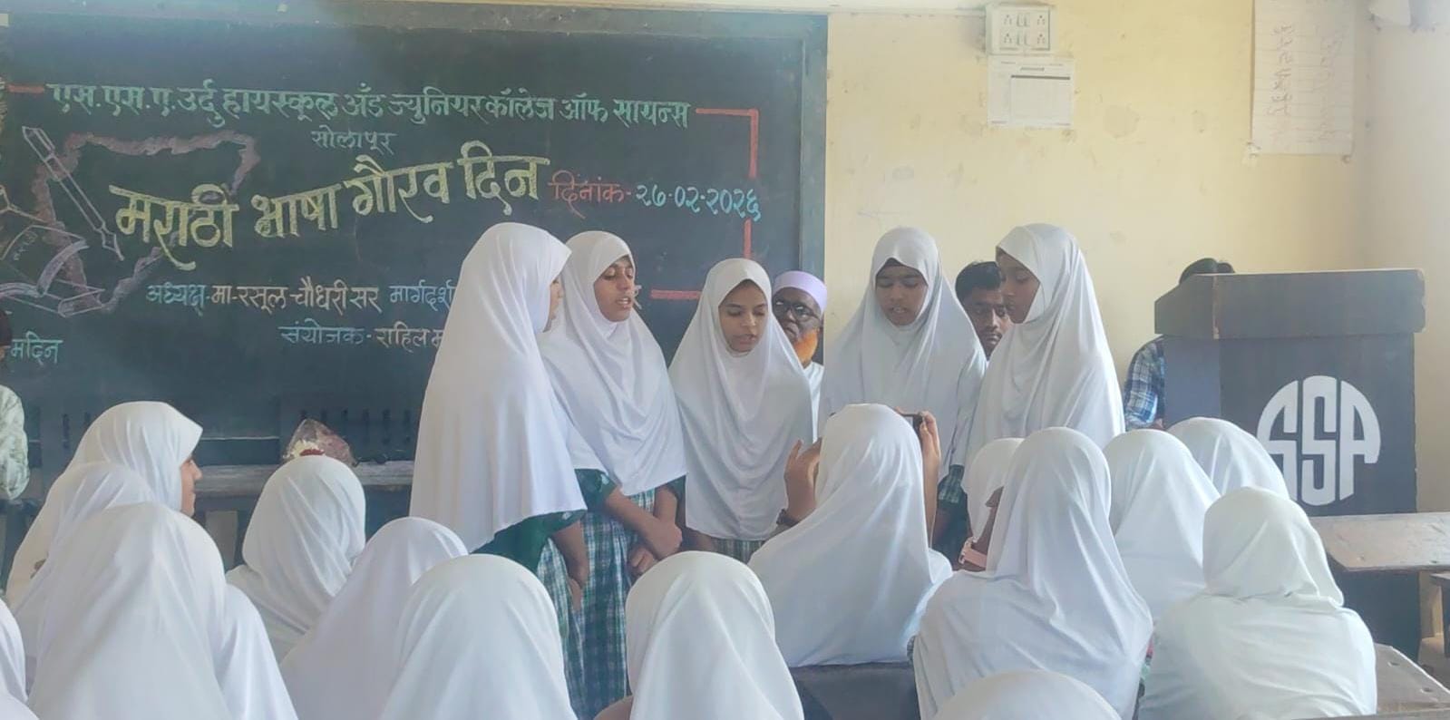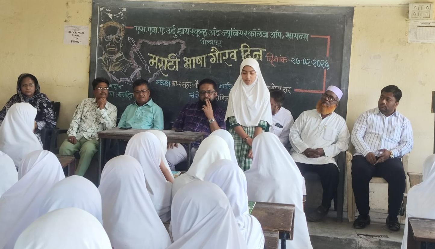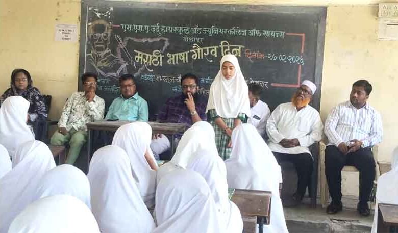 ​سولاپور :28؍فروری(سلطان اختر):شہر کے مشہور تعلیمی ادارے سولاپور سوشل ایسوسی ایشن اردو ہائی اسکول میں 27 فروری کو معروف مراٹھی شاعر وشنو وامن شرواڈکر (کسما گرج) کے یومِ پیدائش کی مناسبت سے ‘مراٹھی بھاشا گورو دن’ انتہائی جوش و خروش کے ساتھ منایا گیا۔​پروگرام کا آغاز تلاوتِ کلامِ پاک سے ہوا ۔ اس موقع پر اسکول کے طلبا نے مراٹھی استقبالیہ گیت، مہاراشٹر گیت اور شور آمی سردار جیسے نغمات ,تقاریر,محاورے وغیرہ پیش کر کے حاضرین کو محظوظ کیا۔ اسکول کے ہیڈ ماسٹر رسول چودھری نے صدارتی خطاب میں زور دیا کہ مراٹھی زبان ہماری ریاست کی پہچان ہے اور ہمیں اسے اپنی روزمرہ کی زندگی میں مقام دینا چاہیے۔​شعبہ مراٹھی کے سینیئر استاد دلدار شیخ نے کہا کہ طلبہ میں مراٹھی زبان کی مٹھاس اور اس کی اہمیت کو عام کرنے کی ضرورت ہے۔ خوشگوار تقریب کے دوران مختلف مقابلوں کے فاتح طلبا کو انعامات سے نوازا گیا۔​اس کامیاب پروگرام کی ترتیب و پیشکش میں راہل ملا، وسیم ساغر، سمیہ شیخ اور دیگر اساتذہ بشمول محمد حسین تامبولی، مظہر خان پٹھان اور آفرین مجاور نے سرگرم حصہ لیا۔ تقریب میں رضوان شیخ, نائب صدر مدرس امتیاز شابدی، سپروائزر یاسمین شیخ اور الطاف کمٹھے بھی موجود تھے۔