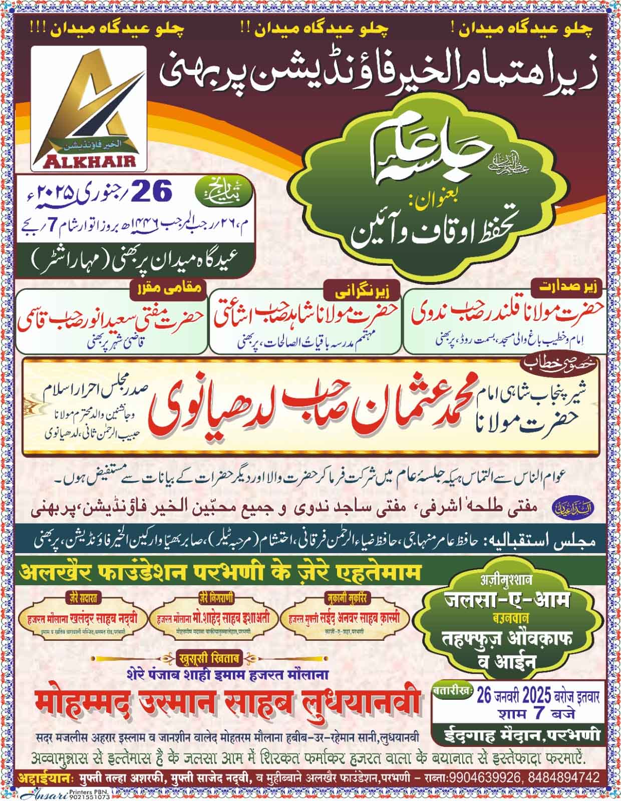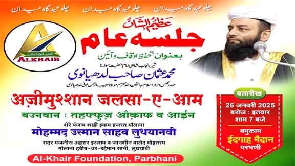 پربھنی: 24؍جنوری( بذریعہ ضلع نامہ نگار اعتبار نیوز محمد سرور شریف ) وطن عزیز ہندوستان کی مشہور و معروف شخصیت نوجوان دلوں کی دھڑکن، خطیب عصر , شاہی امام شیر پنجاب حضرت مولانا عثمان رحمانی لدھیانوی مد ظلہ العالی صدر مجلس احرار اسلام و جانشین ( والد محترم مولانا حبیب الرحمن ثانی لدھیانوی ) کی 26 جنوری 2025 بروز اتوار کو شہر عزیز پربھنی میں آمد ہو رہی ہے اس مناسبت سے الخیر فاؤنڈیشن، پربھنی کے زیراہتمام دو خصوصی اجلاس منعقد کیے گئے ہیں۔پہلا اجلاس صبح 10 بجے افتخار پارک، دھر روڈ، پربھنی میں منعقد ہوگا۔ یہ جلسہ خاص طور پر علماء کرام ، وکلا حضرات ، اساتذہ اور دیگر دانشوران قوم و ملت کے لیے مختص ہے۔ اس خصوصی نشست میں حضرت والا اپنے مواعظ حسنہ سے شرکا ء اجلاس سے مستفد فرمائیں گے اسی دن دوسرا عمومی اجلاس بعنوان تحفظ اوقاف و آئین بعدنماز مغرب 7 بجے بمقام عیدگاہ میدان، جنتور روڈ، پربھنی میں منعقد ہوگا اس عظیم الشان جلسہ عام سے حضرت مولانا عثمان لدھیانوی مد ظلہ العالی اپنے مخصوص لب لہجہ میں مخاطب فرمائیں گے جبکہ مولانا قلندر خان ندوی (پربھنی) اس جلسہ عام کی صدارت کریں یہ دو عظیم الشان پروگرام مولانا شیخ شاہد اشرفی (مہتمم، مدرسہ باقیات الصالحات، پربھنی) کی نگرانی میں منعقد ہونگےاس کے علاوہ قاضی شریعت مفتی محمد سعید انور قاسمی ( امام، مسجد عدروسیہ، پربھنی) بھی مقامی مقرر کی حیثیت عوام الناس سے خطاب فرمائیں گے۔ داشوران قوم و ملت اور عوام الناس سے ان دونوں اجلاس سے استفادہ کی پر خلوص گزارش مفتی شیخ طلحہ اشرفی، مفتی شیخ ساجد ندوی اور الخیر فاؤنڈیشن کےارکین حافظ ضیاالرحمن فرقانی , حافظ عامر منھاجی نے کی ہے۔