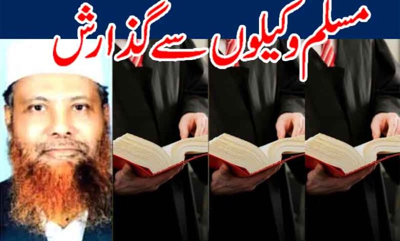 مجھے پورا یقین ہے کہ دوسرے پیشوں سے تعلق رکھنے والے مخلص مسلمانوں کی طرح ہمارے مسلم وکلاء بھی اپنے دین و ایمان اور قوم و ملت کے لئے اتنے ہی مخلص ہیں۔ اسی احساس کی وجہ سے ایک درخواست تمام مسلم وکلاء کی خدمت میں پیش کر رہا ہوں:
