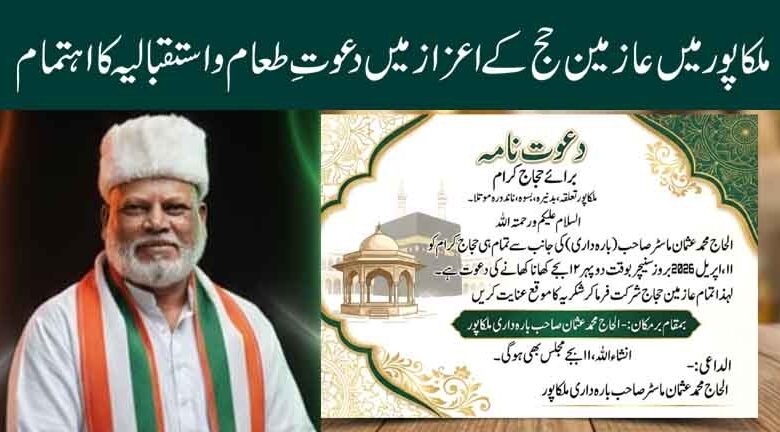 ملکاپور: 9 / اپریل (محمد احسان سر ) ملکاپور تعلقہ کے بدنیرا، بسوہ، ناندورہ اور موتلا علاقوں سے تعلق رکھنے والے عازمینِ حج کے اعزاز میں الحاج محمد عثمان نور ماسٹر،( بارہ داری ، ملکاپور ) نائب صدر بلڈھانہ ضلع کانگریس کمیٹی اقلیتی شعبہ کی جانب سے ایک پروقار استقبالیہ اور دعوتِ طَعام کا اہتمام کیا گیا ہے. موصولہ اطلاع کے مطابق یہ تقریب 11 اپریل 2026 بروز سنیچر دوپہر 12 بجے الحاج محمد عثمان صاحب کی رہائش گاہ، بارہ داری ملکاپور میں منعقد ہوگی. اس موقع پر عازمینِ حج کا استقبال کیا جائے گا اور ان کے اعزاز میں پرتکلف کھانے کا بھی اہتمام کیا گیا ہے. مزید برآں، اسی دن صبح 11 بجے ایک خصوصی مجلس بھی منعقد ہوگی، جس میں عازمینِ حج کے لیے دعائیں اور نیک تمناؤں کا اظہار کیا جائے گا. الحاج محمد عثمان نور ماسٹر صاحب نے تمام متعلقہ علاقوں کے عازمینِ حج سے شرکت کی اپیل کرتے ہوئے کہا ہے کہ وہ اس بابرکت موقع پر شرکت فرما کر تقریب کو کامیاب بنائیں اور دعاؤں سے نوازیں.