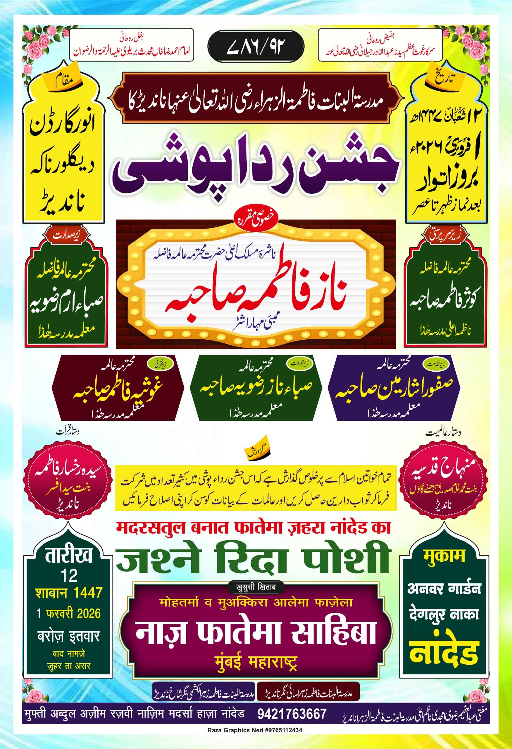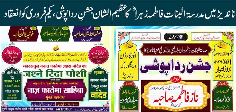 ناندیڑ میں مدرسۃ البنات فاطمہ زہراؓ کا عظیم الشان جشنِ رداپوشی، یکم فروری کو انعقاد