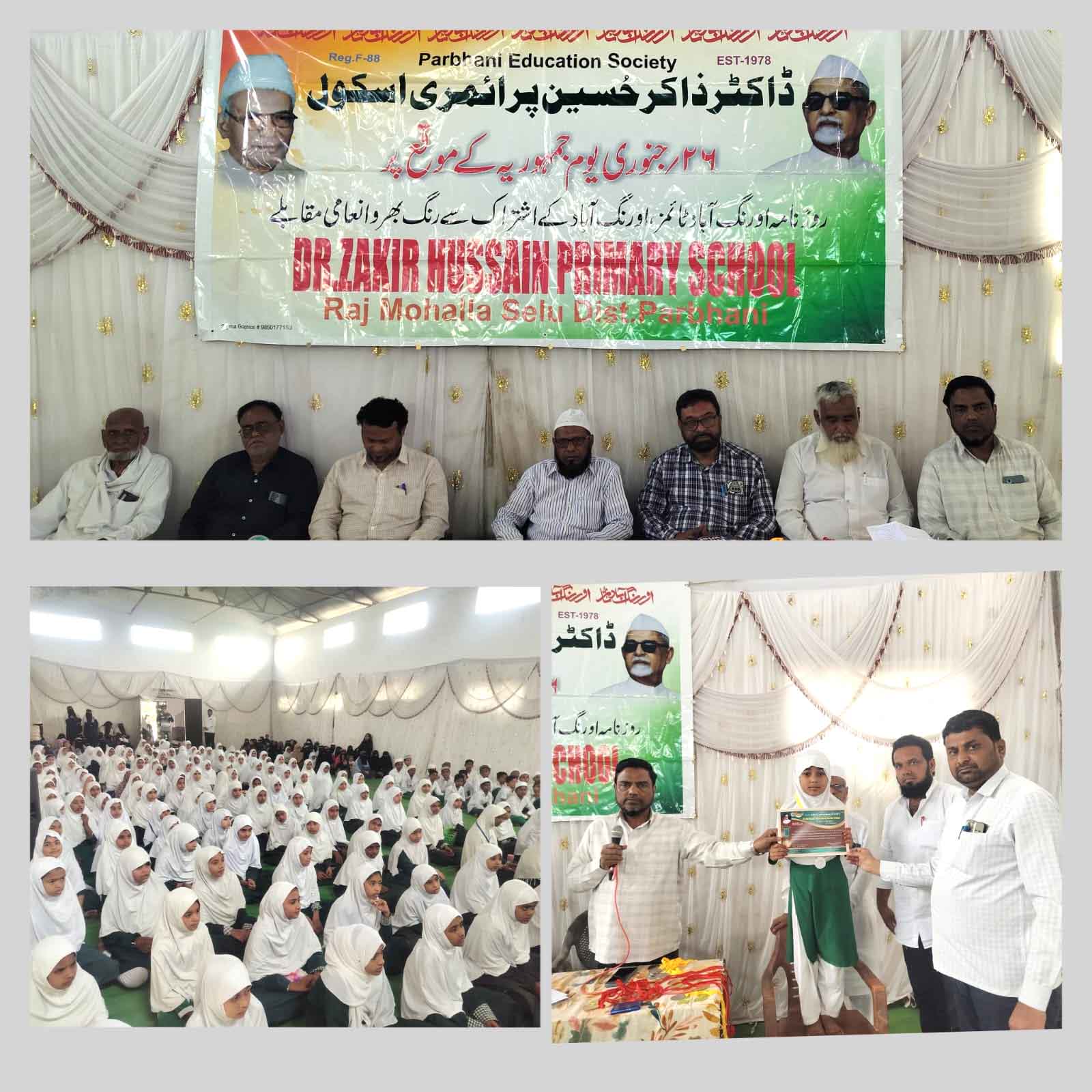 سیلو:31؍جنوری ( ضلع نامہ نگار اعتبار نیوز محمد سرور شریف پربھنی): پربھنی ایجوکیشن سوسائٹی پربھنی کے زیرِ انتظام ڈاکٹر ذاکر حسین پرائمری اسکول، سیلو ضلع پربھنی میں صدر مدرس محمد عبدالعلیم صوفی کی سرپرستی میں جشنِ یومِ جمہوریہ کی مناسبت سے منعقدہ مختلف تعلیمی، ثقافتی اور کھیلوں کے مقابلوں کی تقریبِ تقسیمِ انعامات نہایت تزک و احتشام کے ساتھ منعقد کی گئی۔ اس تقریب کے پہلے سیشن کا آغاز مدینہ فنکشن ہال میں صبح 9 بجے صدر مدرس محمد عبدالعلیم کی صدارت میں ہوا، جس میں مہمانِ خصوصی کے طور پر حافظ جنید صاحب ندوی نے شرکت کی۔ پروگرام کا آغاز جماعت سوم کے طالب علم زید شیخ خضر کی تلاوتِ کلامِ پاک سے ہوا جبکہ مدیحہ ناصر شیخ نے ہدیہ نعت پیش کیا۔ صدرِ مجلس محمد عبدالعلیم صوفی نے والدین اور طلبہ سے مخاطب ہوتے ہوئے تعلیم کے میدان میں سخت محنت کی تلقین کی اور سرپرستوں کو ہدایت دی کہ وہ بچوں کو صبح جلد بیدار کرنے، صاف ستھرا لباس پہنانے اور ہوم ورک کی پابندی کروانے پر توجہ دیں۔تقریب کا دوسرا سیشن الحاج محمد رئیس قاسمی صاحب (خطیب و امام مدینہ مسجد، سیلو) کی صدارت میں منعقد ہوا، جس کا آغاز عمر اشفاق احمد جماعت ہفتم کےطالب علم کی تلاوت اور آسیہ شیخ اشرف کی نعتِ نبی ﷺ سے ہوا۔ اس موقع پر کلیم صاحب بیلدار (ضلع صدر بیلدار سماج سیوا سنگھ)، محمد اسحاق صاحب (پترکار)، اور سید حامد صاحب (نمائندہ اورنگ آباد ٹائمز) بطور مہمانِ خصوصی شریک ہوئے، جبکہ کیریئر کونسلر امیر خان صاحب نے خصوصی شرکت کی۔ جناب امیر خان نے اپنے خطاب میں کہا کہ آج کے دور میں تعلیم ہی دنیا فتح کرنے کا ذریعہ ہے، انہوں نے والدین کو بیٹیوں کو اعلیٰ تعلیم دلوانے اور ان کے روشن مستقبل کے لیے قربانی دینے پر زور دیا۔امیر خان صاحب نے اپنے ولولہ انگیز خطاب میں ایک شعر کے ذریعے طلبہ کی ہمت افزائی کی: