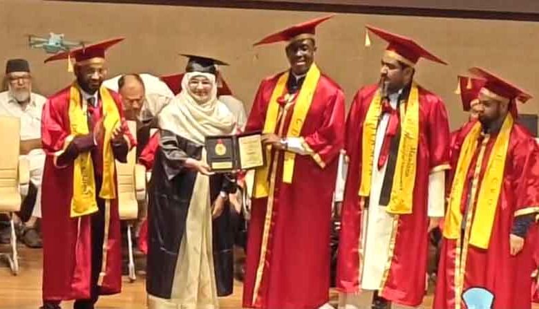 پربھنی :18؍اپریل ( محمد سرور شریف ضلع نامہ نگار) پربھنی کے جامعہ اسلامیہ اشاعت العلوم میڈیکل کالج بدناپور کی طالبہ ڈاکٹر شمین ناز بنت مخدوم فاروقی نیّر (آرٹ ٹیچر کنّڑ) نے اینستھیزیا میں ایم ڈی کا کورس کامیابی کے ساتھ مکمل کیا۔ اس موقع پر میڈیکل کالج بدناپور میں منعقدہ ایک باوقار تقریب میں انہیں ڈگری تفویض کی گئی۔ ڈاکٹر شمین ناز، ڈاکٹر شایان خان (ایم ڈی میڈیسن) کی اہلیہ ہیں۔ ان کی اس نمایاں کامیابی پر افرادِ خاندان کے علاوہ اساتذہ اور اہم سماجی و ملی شخصیات نے مبارکباد پیش کرتے ہوئے اسے نہ صرف ان کے لیے بلکہ ملت اور انسانیت کے لیے ایک نیک فال قرار دیا۔