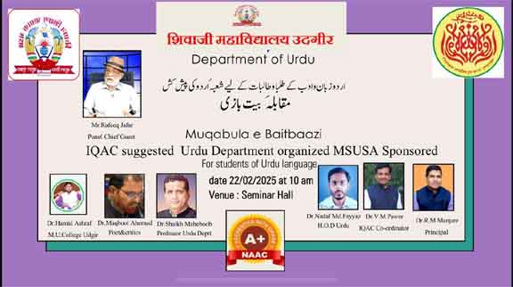 اودگیر :25فروری (پریس ریلیز) شعبۂ اردو شیواجی کالج اودگیر اور مہاراشٹر اسٹیٹ اردو ساہتیہ اکادمی ممبئی ، کے اشتراک سے 22 فروری 2025 کو ڈگری کالج کے طلباوطالبات کے لیے بیت بازی کا مقابلہ منعقد کیا گیا۔ جس میں بی اے ، بی کام ، بی .ایس سی کے طلبا و طالبات نے کثیر تعداد میں شرکت کی۔